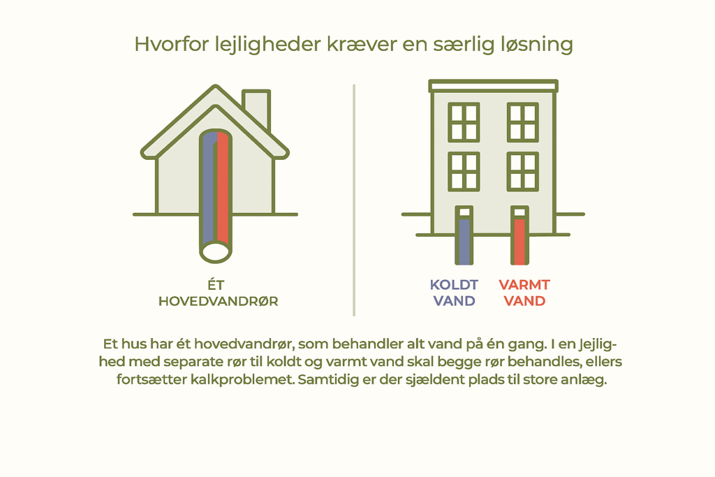 I et hus er der typisk kun ét hovedvandrør, hvilket gør det lettere at installere et anlæg, der behandler alt vand på én gang. I en lejlighed med både koldt og varmt vand indført separat er udfordringen større. Her skal man have en løsning, der kan håndtere begge rør, ellers vil man kun behandle halvdelen af vandet, og kalkproblemet vil fortsætte i den anden del af installationen. Samtidig er der ofte mindre plads til store anlæg, og man har sjældent mulighed for at ændre selve rørføringen. Derfor er nemme, kompakte løsninger attraktive for lejlighedsbeboere.