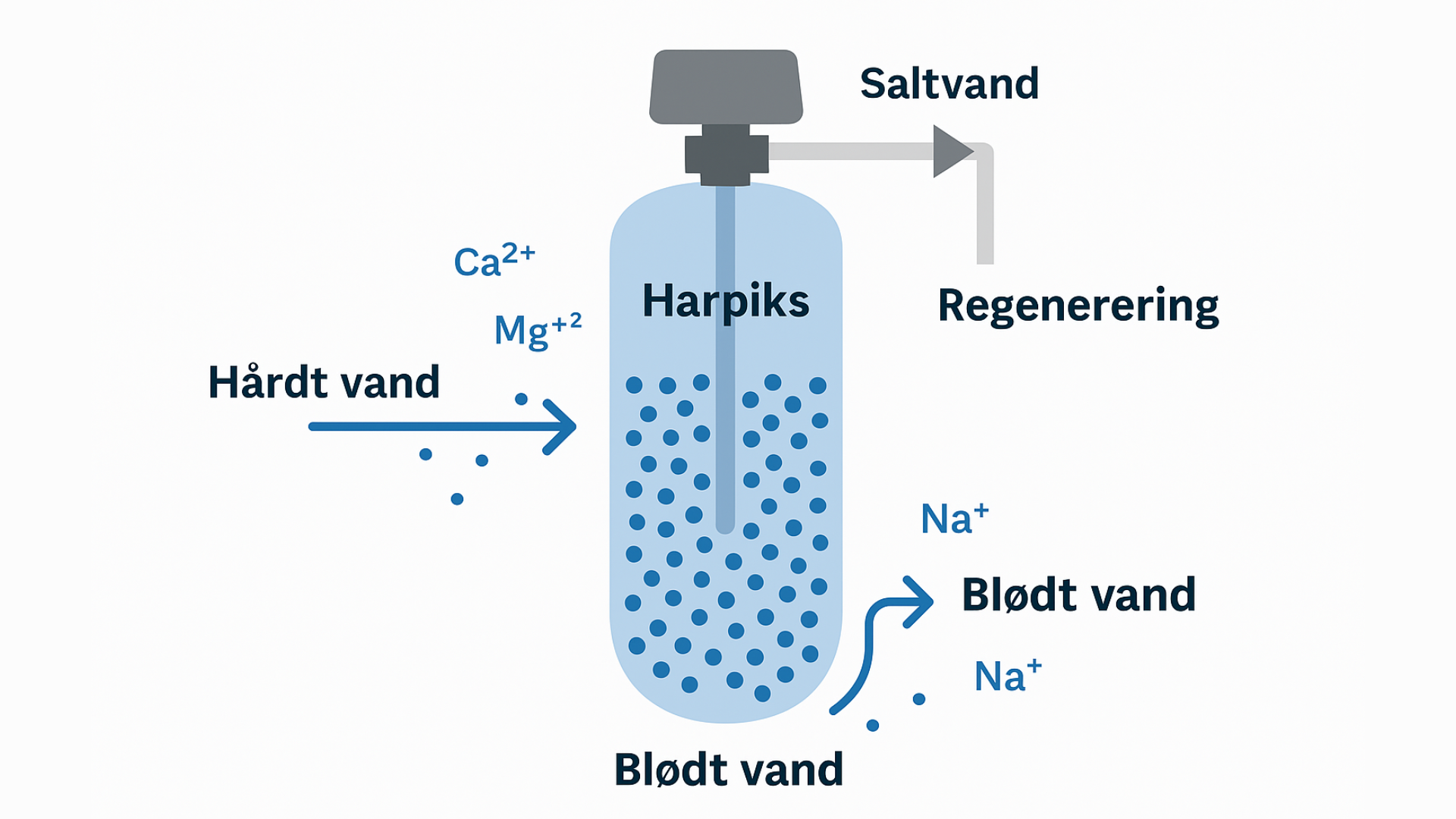 Når harpiksen er mættet, starter anlæggets regenereringsproces, hvor det skylles med nyt saltvand for at blive klar til næste omgang. Mange anlæg har en indbygget vandmåler, der automatisk igangsætter regenerationen, når forbruget når et vist niveau.