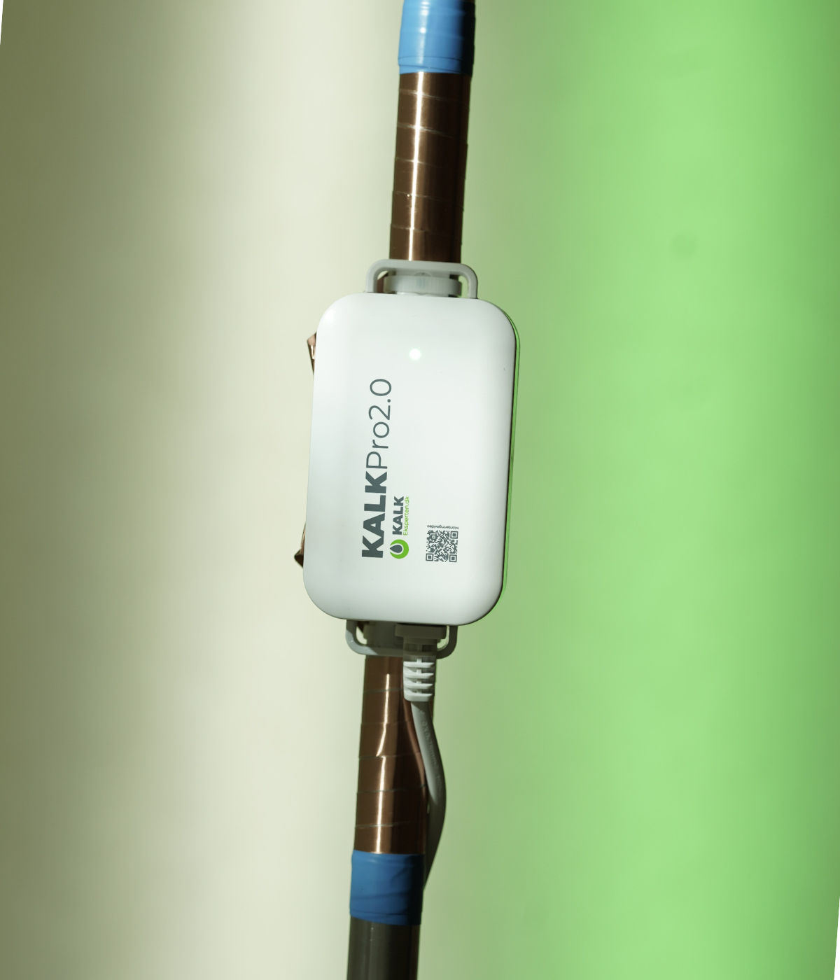 Vores KalkPro‑teknologi danner et pulserende elektromagnetisk felt rundt om vandrøret. Feltet ændrer selve krystalliseringen af kalk, så den hårde calcit bliver til den bløde aragonit. Aragonit skylles ud med vandet i stedet for at sætte sig som hård belægning på varmelegemer og armaturer.